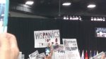 Crowd members hold signs reading “Hispanics For Trump” and “Veterans For Trump”